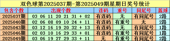 双色球在第2025037期-第2025049期周日开奖中,有4期奖号包含连码组合,连码出现比例较高;有3期开奖包含了重号,重号出现比例较低;同尾号码开出了4次,出现比例较高。
